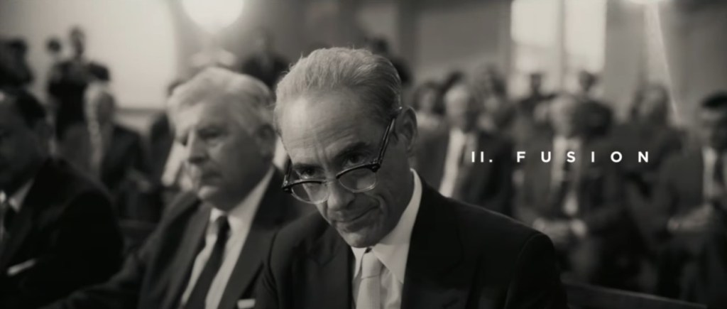 Ne vous fiez pas aux apparences. Ce n’est pas parce que la partie dans laquelle les faits relatés par Lewis Strauss en Noir et Blanc semblent plus « objectifs » qu’ils ne laissent pas filtrer les couleurs de la blessure de celui-ci lorsqu’il raconte sa version de l’histoire de la découverte de la fission de nos mondes quantiques avec la fusion de notre monde classique:)